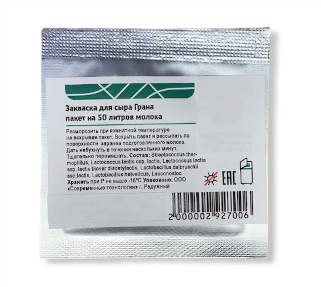 Состав: Streptococcus thermophilus, Lactococcus lactis ssp. lactis, Lactococcus lactis ssp. lactis biovar diacetylactis, Lactobacillus delbrueckii ssp.lactis, Lactobacillus helveticus, Leuconostoc